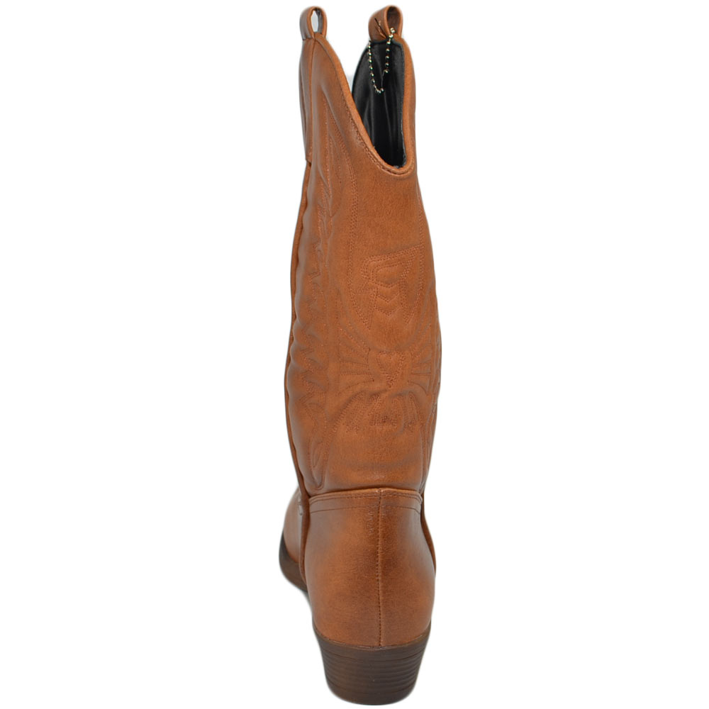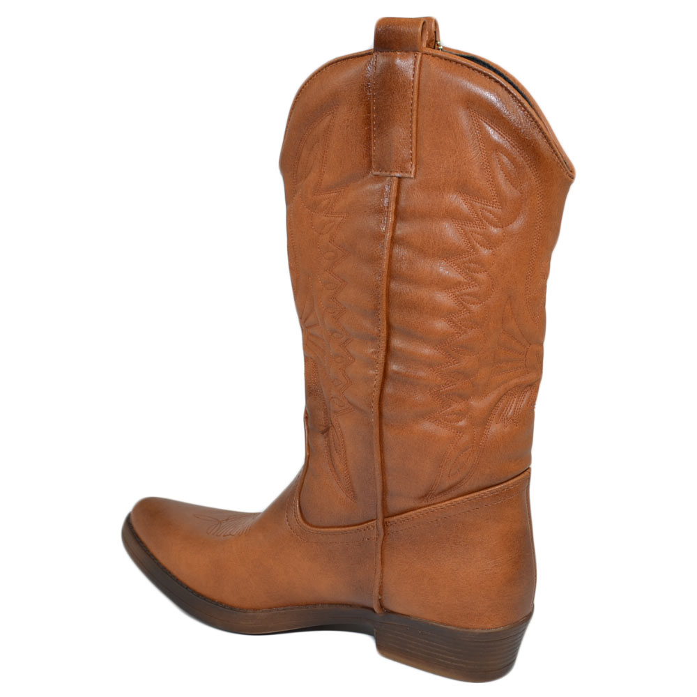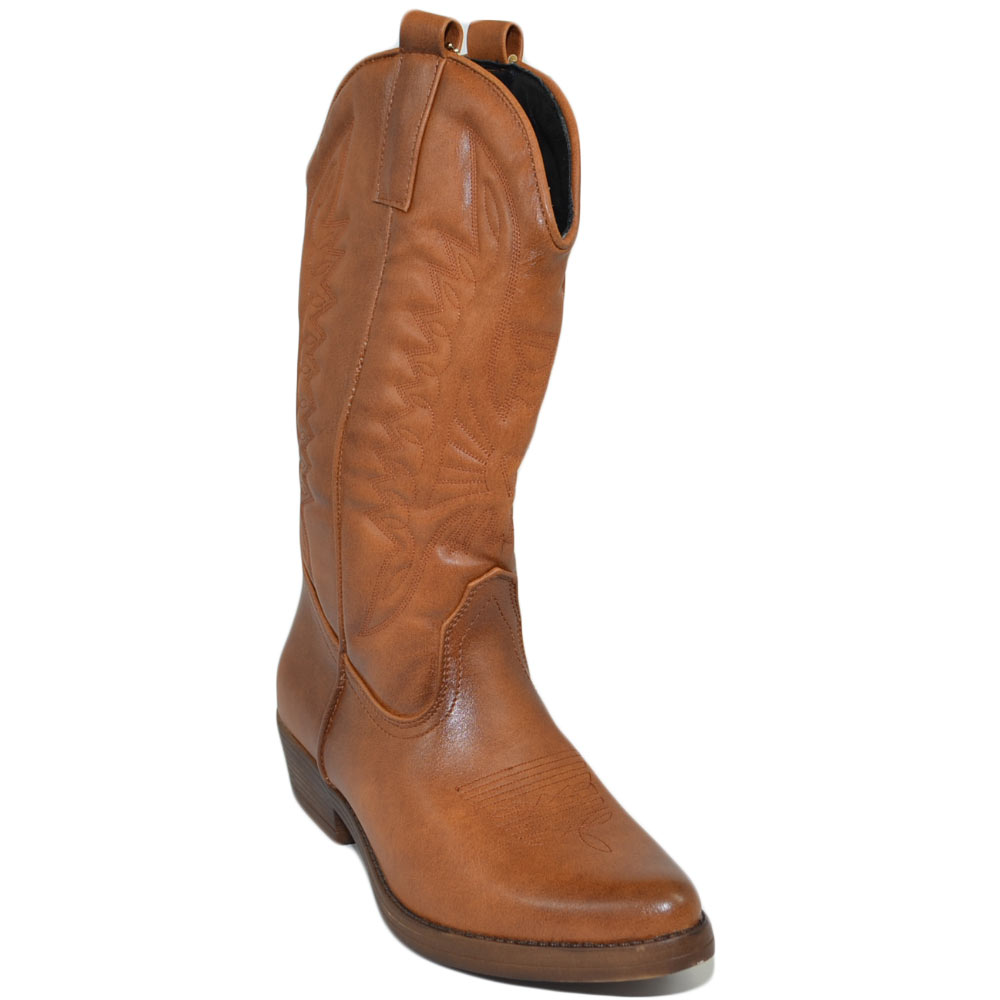 Stivali donna camperos texani stile western cuoio con fantasia laser su pelle tinta unita altezza polpaccio