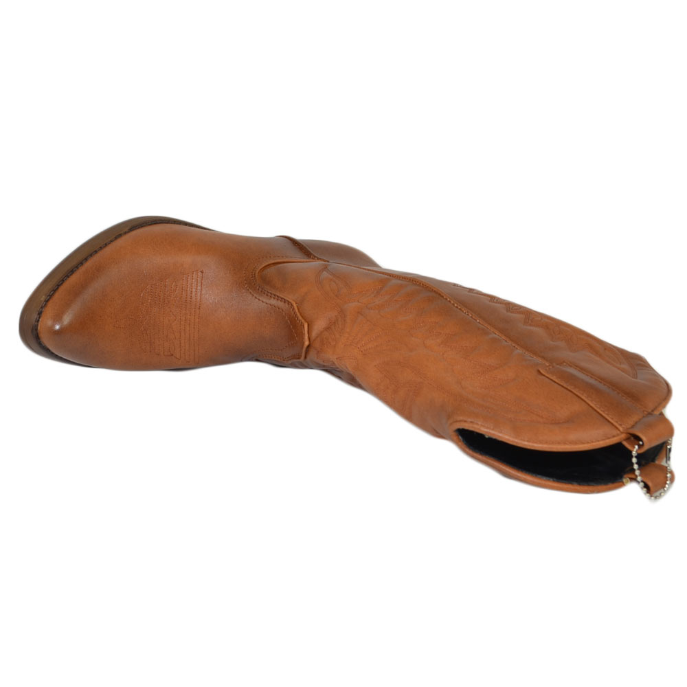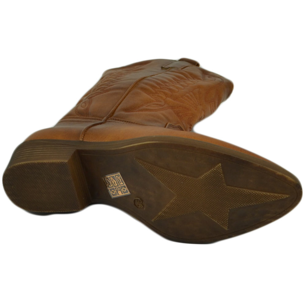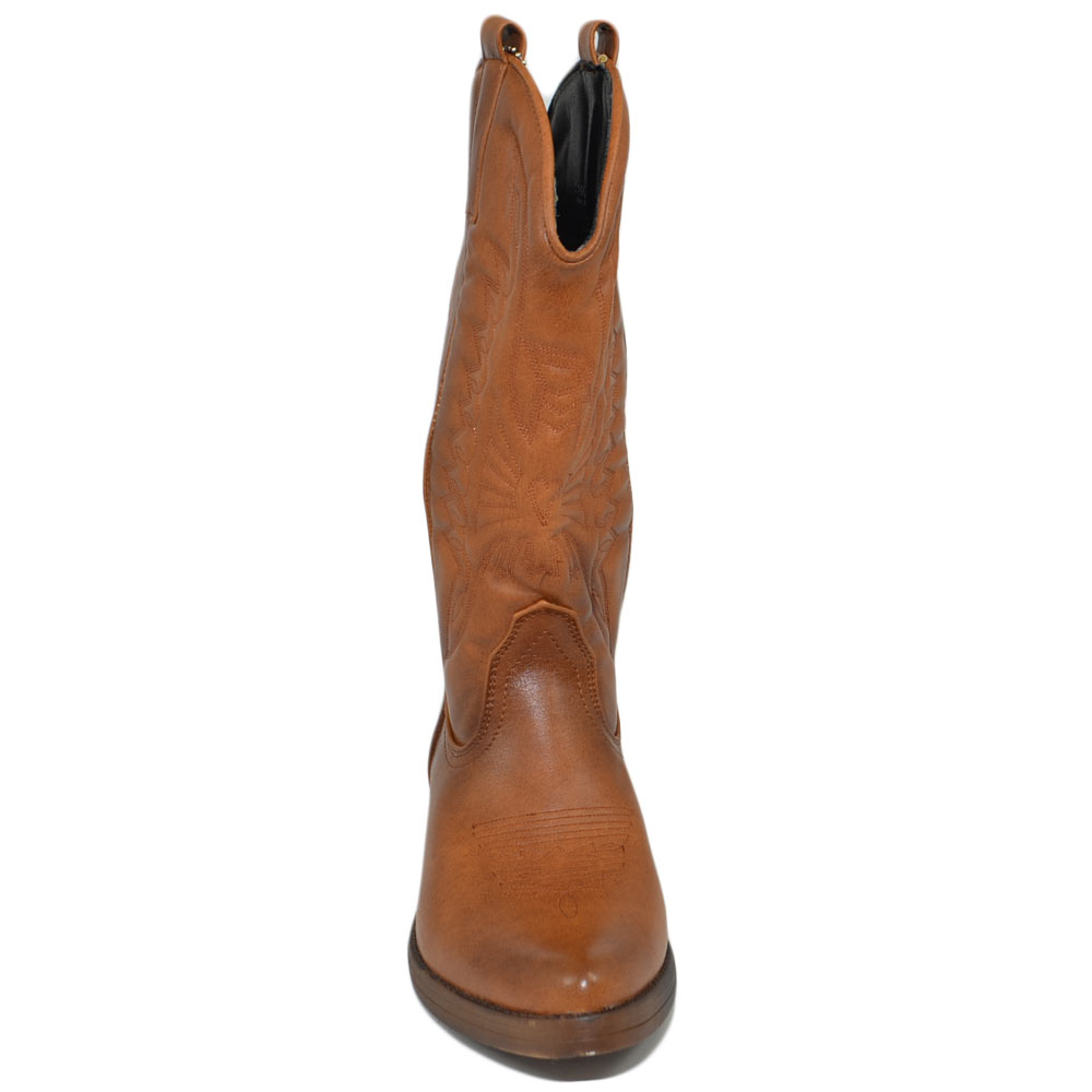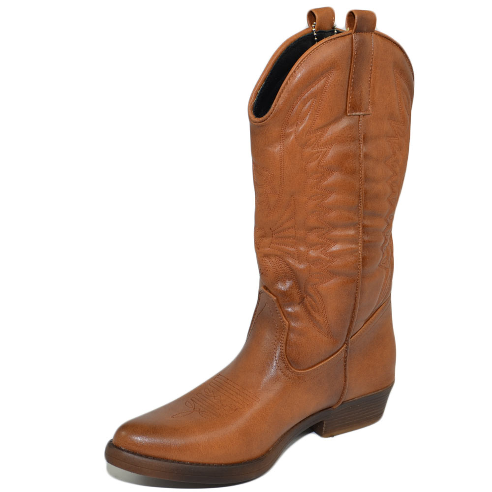 Stivali donna camperos texani stile western cuoio con fantasia laser su pelle tinta unita altezza polpaccio