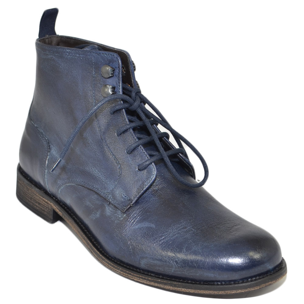 Anfibi stivali uomo N02 LS Luisantiago vera pelle di capra blue avion spazzolato ganci ottone suola cuoio retro' dandy