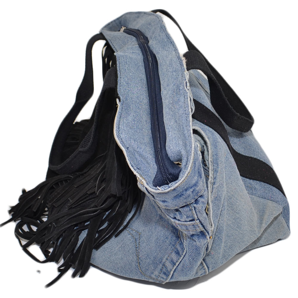 Borsa a braccio donna in jeans vintage e vera pelle scamosciata nero con frange xl moda capiente zip scompartimenti