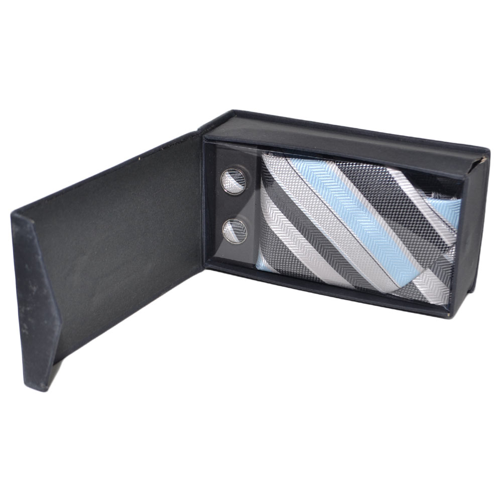 SET CRAVATTA UOMO ELEGANTE IN RASO AZZURRO STRIATA CON GEMELLI E POCHETTE PER CERIMONIE EVENTI