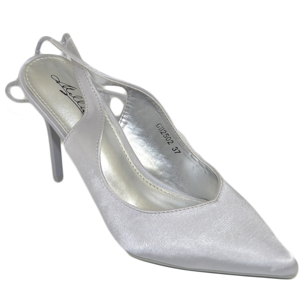 Scarpe decollete' donna a punta slingback in raso bianco brillantini e trasparenza tacco sottile 12cm cinturino tallone .