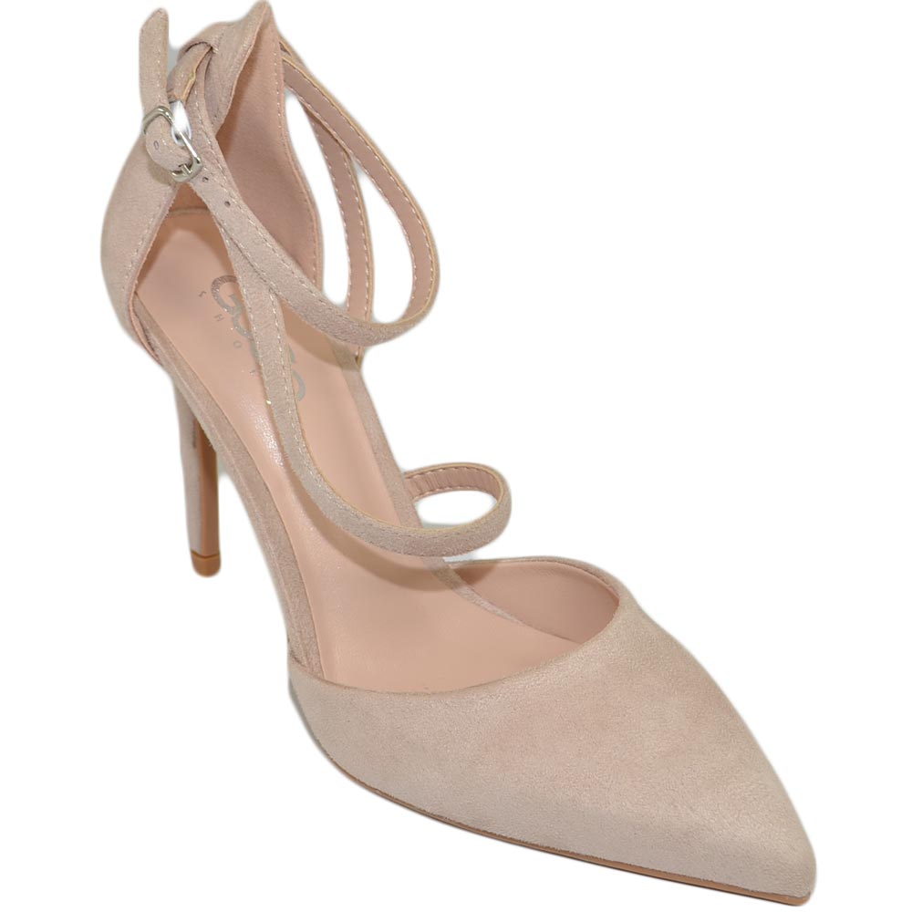 Scarpe donna decollete a punta elegante camoscio nudo tacco a spillo 12 cm aperture laterali e cinturino incrociato mod