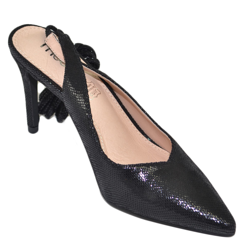 Decollete a punta donna in raso nero tallone scoperto allacciatura alla schiava con lacci tacco sottile 12 cm moda .