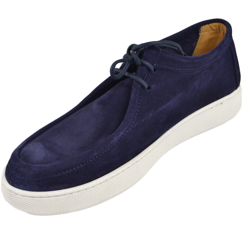 SCARPA UOMO MODELLO INGEGNERE IN VERA PELLE SCAMOSCIATO BLU CON GOMMA BIANCA ULTRALEGGERA E LACCI TONO SU TONO